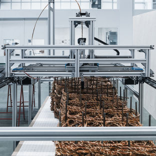 The collaborative research project WILLOW WEAVE investigated digitally prefabricated earth-willow-wood hybrid ceiling components with the aim of expanding and diversifying the range of regrowing and recyclable building materials through digital design and fabrication methods.